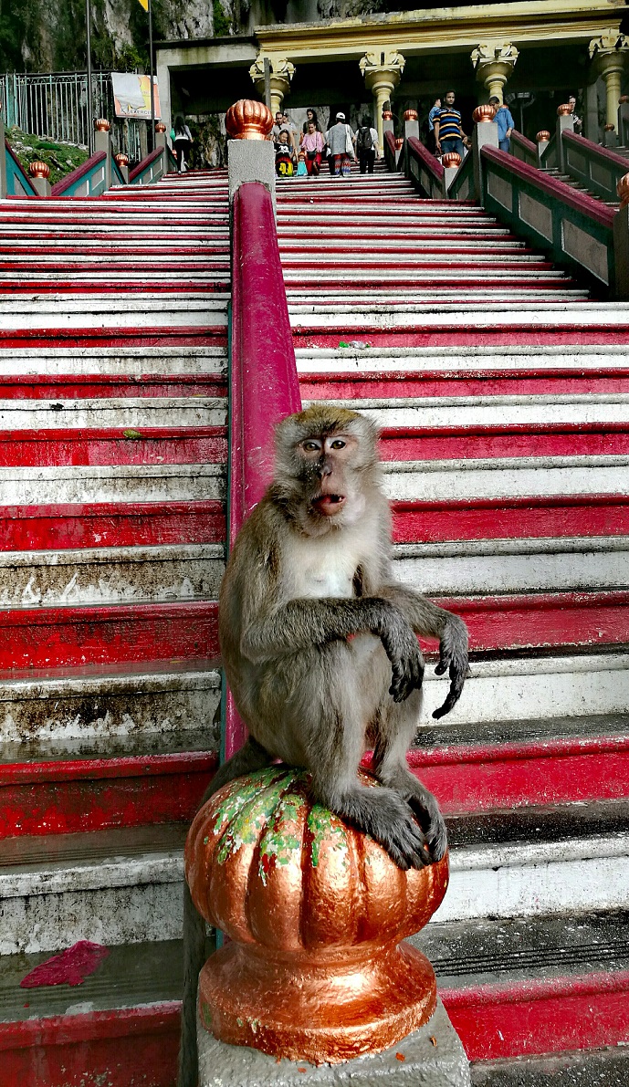 Diese Batu Cave ist ein Tempel in einer Höhle und dort wimmelt es von Affen. Die sind richtig wiff und erkennen sofort wenn jemand was zum Essen mit hat. So schnell kann man dann gar nicht schauen und die haben das schon gestohlen.