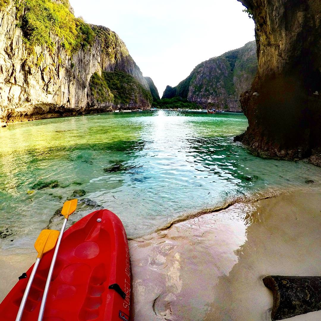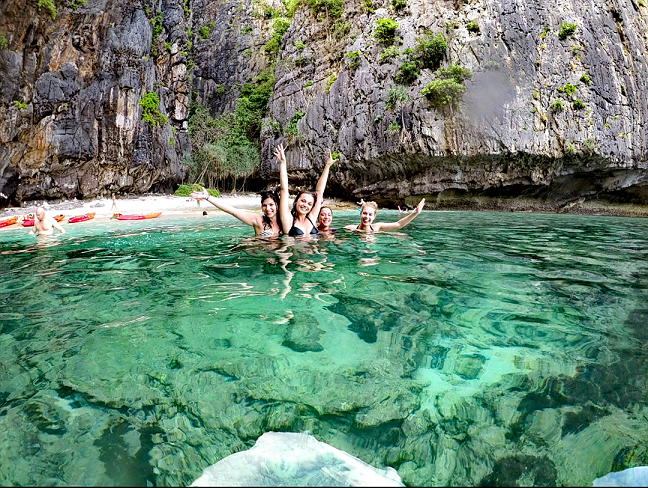 Am Tag haben wir alle gemeinsam eine Bootstour auf einen Piratenboot gemacht. Dort haben wir die bekannten Strände wie den Monkey Beach und Maya Beach besucht. Außerdem hats dort auch die Möglichkeit gegeben mit Kajaks zu fahren oder sich eine Schnorchelausrüstung auszuborgen. Dadurch dass wir 20 Leute waren, war das halbe Schiff voll mit Austauschstudenten und wir haben richtig viel Spaß gehabt. Am Abend kann man in die verschiedenen Bars und Discos am Strand gehen. Neben Feuershows gibt es auch so kleine Spiele wie Seilspringen oder Limbo-Tanzen. Getrunken werden frische Fruchtbowlen aus kleinen Sandkisten-Kübeln ;) Der Abend dort hat richtig Spaß gemacht und ihr könnt auch vorstellen, dass es am nächsten Tag in der Fähre nach Phuket sehr ruhig war :P